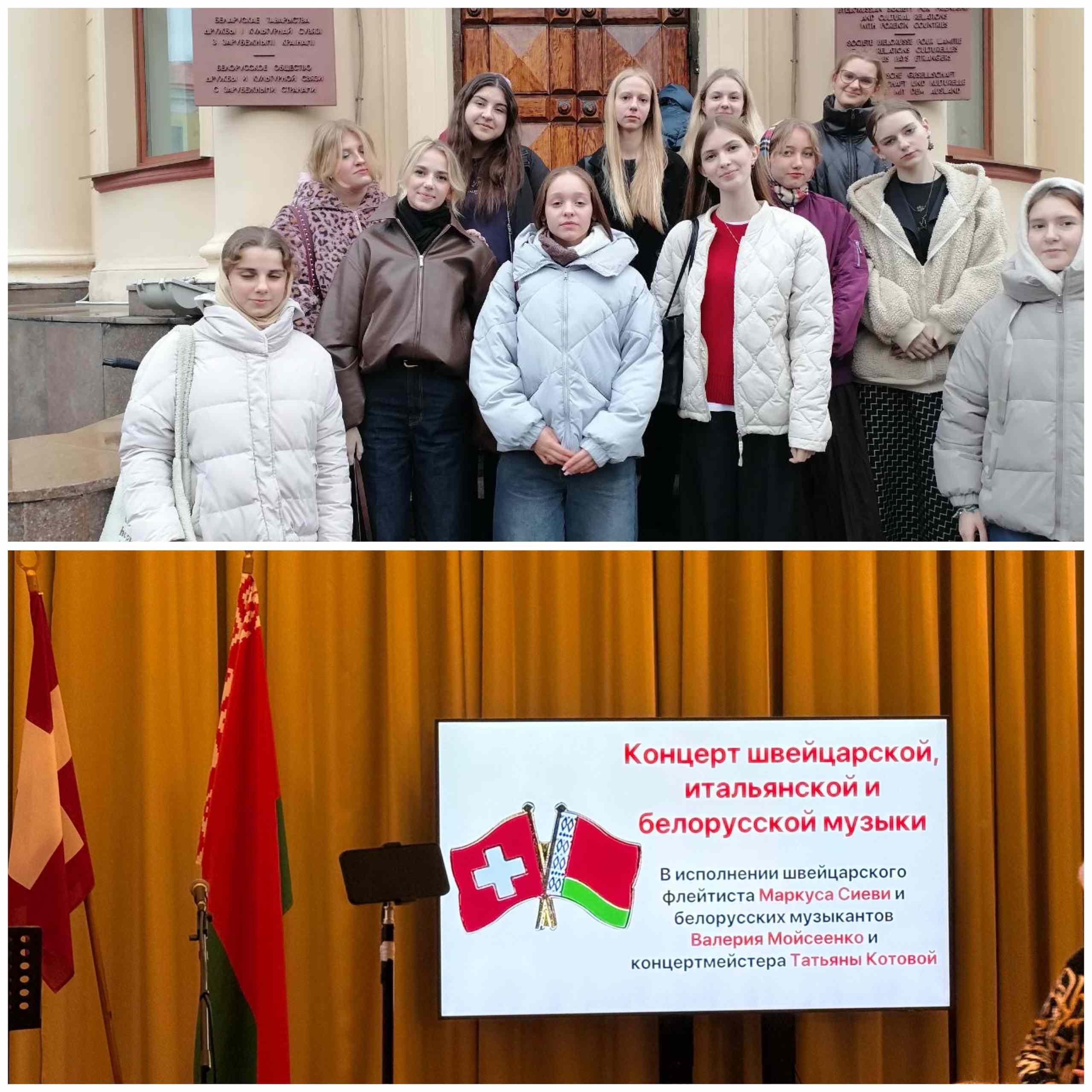 📌27.10 21 СБ учебная группа вместе с куратором Хведелиани Е. Г. посетили Дом дружбы, где прошел концерт швейцарской, итальянской и белорусской музыки в исполнении швейцарского флейтиста Маркуса Сиеви и белорусского музыканта Валерия Моисеенко.
