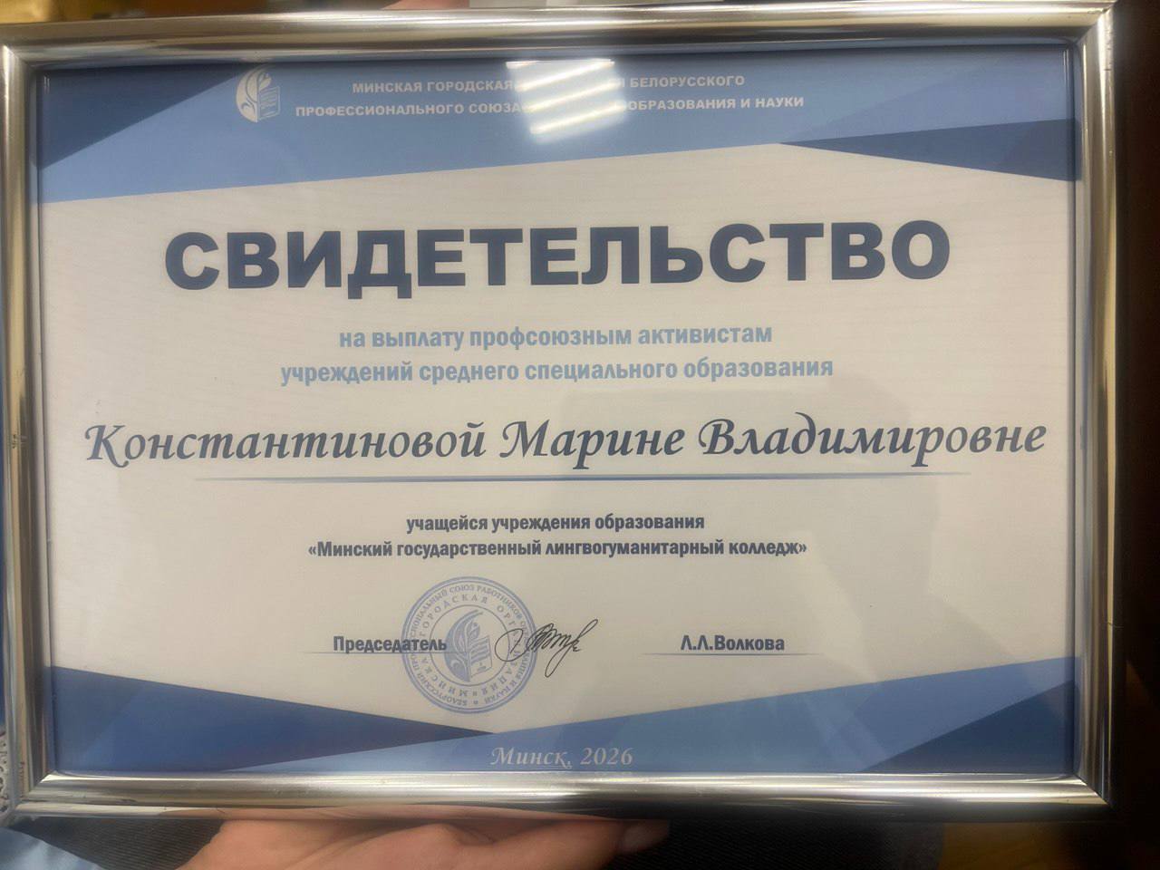 ✏️От нашего колледжа именной профсоюзной стипендией от Минской городской организации Профсоюза работников образования и науки удостоилась учащаяся 34 СП группы Константинова Марина Владимировна. ❣️