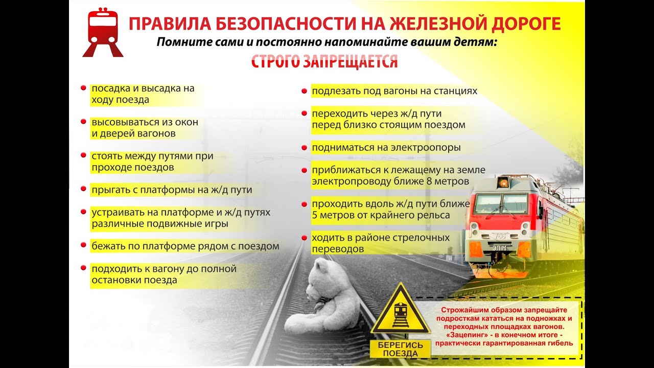 На железной дороге запрещено оставлять детей без присмотра — это может привести к трагическим последствиям. Всегда помните, что, находясь на железнодорожных объектах, детей необходимо держать за руку или на руках.
